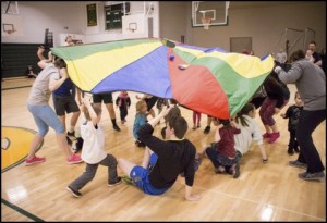 SOBC volunteer coaches lead children and their families through a parachute activity