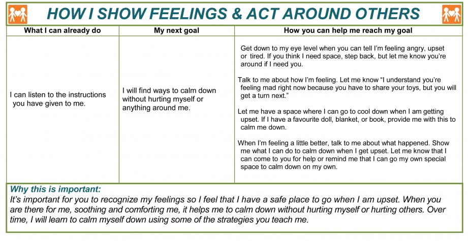 A Hand in Hand support plan is written in the first-person voice of the child in order to encourage parents and caregivers to look at their needs from their perspective. To the same end, it always explains why a given goal is important. A caregiver might legitimately wonder, for instance, why they should put time and effort into promoting the ability to babble back and forth. “Engaging in communication where we give and take sets me up for later conversations in life,” the document might say. “I will learn that when I stop talking, you start and when you stop, it’s my turn!” Within the child-welfare context, this is a departure from more prescriptive language such as, “You must do this” or “You need to do better at that.”